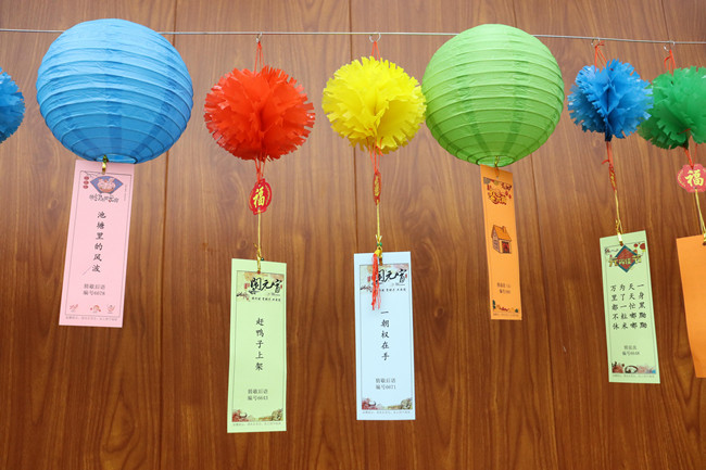 燈謎活動現場,燈籠和彩旗下懸掛著五顏六色百余個謎面,洋溢著濃濃的節日氣氛。燈謎內容涉及冬奧會、傳統知識、生活常識、歇后語等方面,既具趣味性,又具知識性。