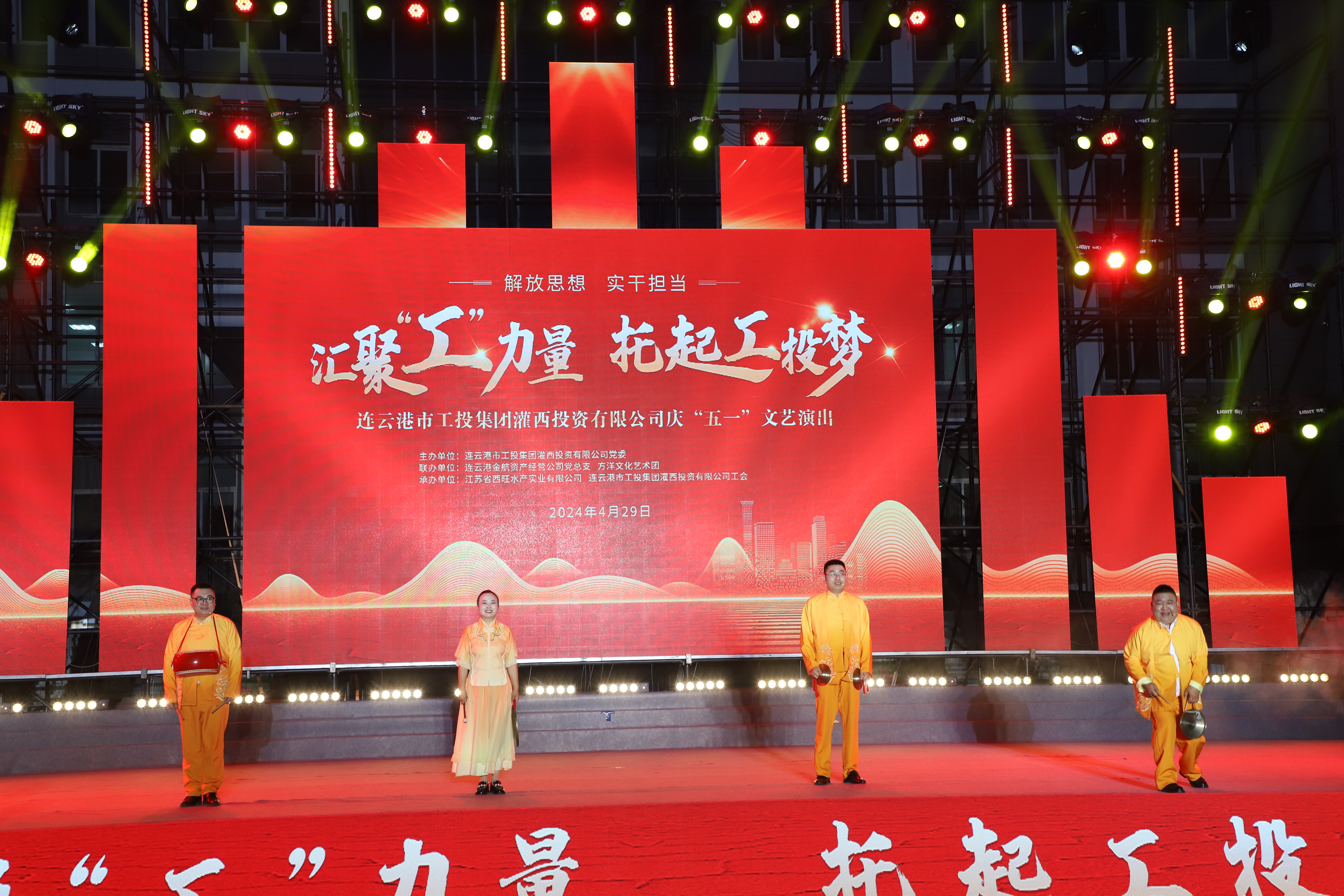 4月29日晚,灌西投資公司《匯聚“工”力量,托起工投夢》慶“五一”文藝演出在機關大樓前廣場舉行。本次活動由灌西投資公司黨委主辦,連云港金航資產經營公司黨總支、方洋文化藝術團聯辦,旨在通過藝術的形式,營造崇尚勞模、學習先進、尊重勞動的良好氛圍,豐富公司員工的文化生活,激發干事創業熱情。集團公司領導張六林、戴鴻鳴、汪群及部分部門負責人,灌西、金航資產經營公司領導班子成員出席演出活動,縣臨港產業區管委會、華能灌云清潔能源發電責任有限公司、徐圩新區方洋集團等有關領導受邀觀看演出。