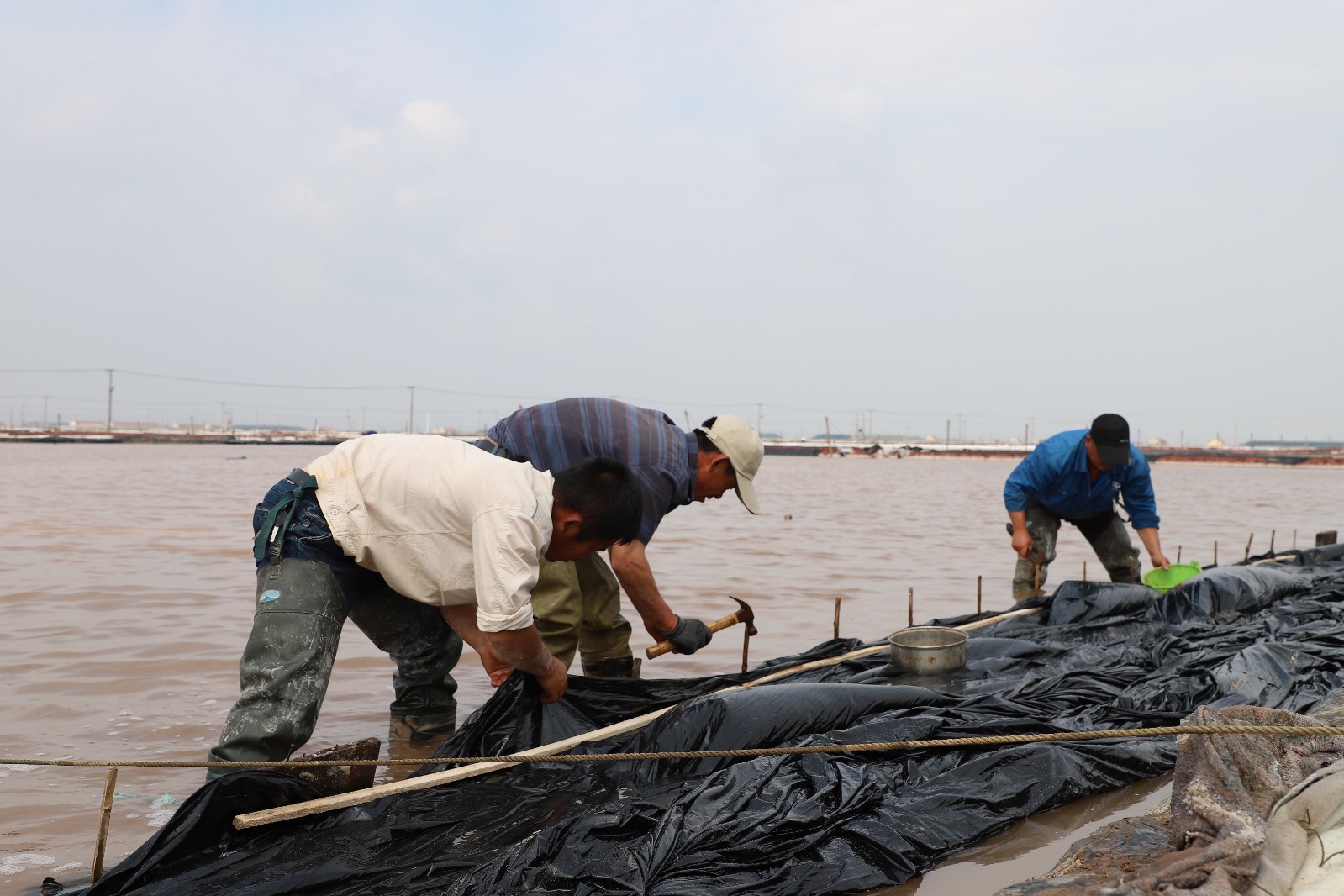 同心支援有溫度。受當晚突發的狂風暴雨強對流天氣,導致日曬制鹽公司38根電線桿被暴風折斷、60塊結晶池塑布受損,20塊塑布需要更換,130余間值班房及機房屋頂瓦面損壞,給鹽業生產造成嚴重安全隱患。6月14日凌晨5點,來自于該公司各條戰線近180人,支援搶險搶時搶工,進行結晶池塑布安裝、廢棄物清理等工作;來自灌西供電所、徐南供電所的兄弟單位14名專業電工,第一時間到生產現場進行清除電力故障、更換電線桿等電力工程作業。充分展現我們工投人在困難面前同力協契、踔厲奮發的拼搏精神,為企業高質量的安全發展奠定堅實基礎。