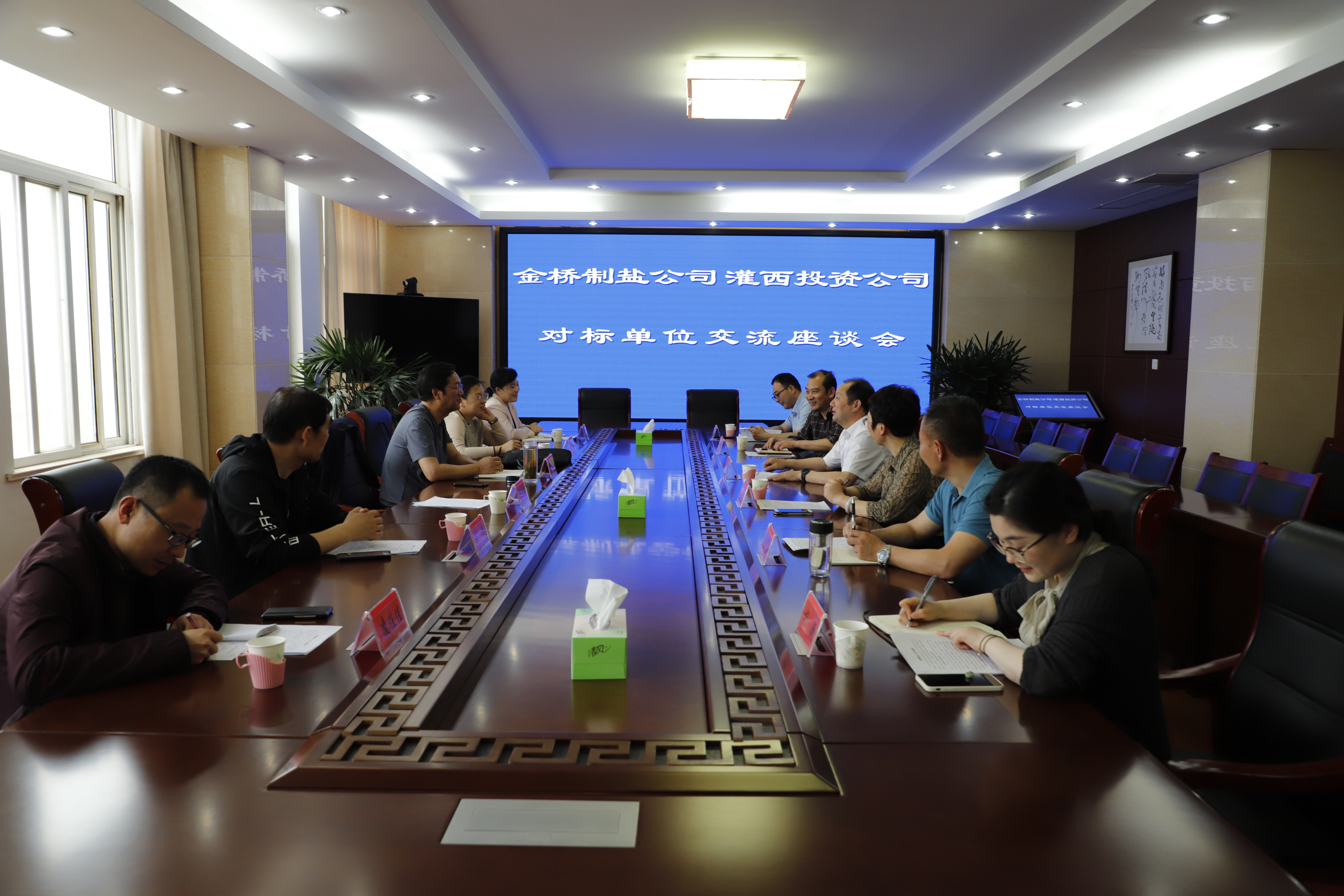 6月3日下午,江蘇金橋制鹽公司黨委副書記、工會主席曹開明率調研組一行,來灌西投資公司進行對標單位交流座談。灌西投資公司黨委書記、董事長、總經理李國文,黨委副書記、工會主席王宏及黨群部門負責人陪同交流。