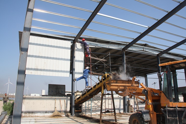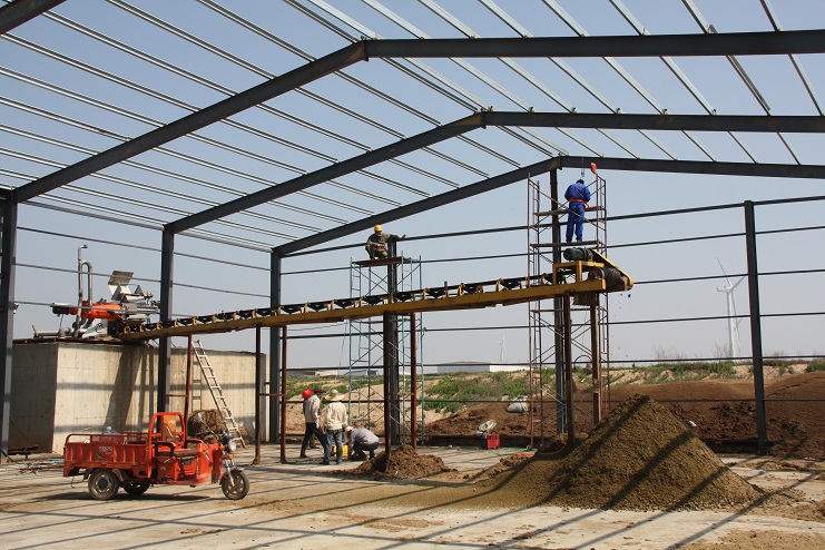 5月18日,位于北北歐農(nóng)莊生豬養(yǎng)殖廠旁邊的綠淮肥業(yè)公司有機(jī)肥生產(chǎn)基地,一個(gè)鋼結(jié)構(gòu)廠房即將完工,只見(jiàn)機(jī)聲轟鳴、焊花飛濺,機(jī)電服務(wù)公司的工人在勞模王緒華帶領(lǐng)下正在焊接鋼結(jié)構(gòu)件,而正在建設(shè)施工中的廠房?jī)?nèi),兩條有機(jī)肥生產(chǎn)線運(yùn)轉(zhuǎn)不停,沒(méi)有因廠房建設(shè)而停產(chǎn),廠房旁邊的一臺(tái)挖掘機(jī)正在整平場(chǎng)地,一邊建設(shè),不邊生產(chǎn),一派紅火景象。