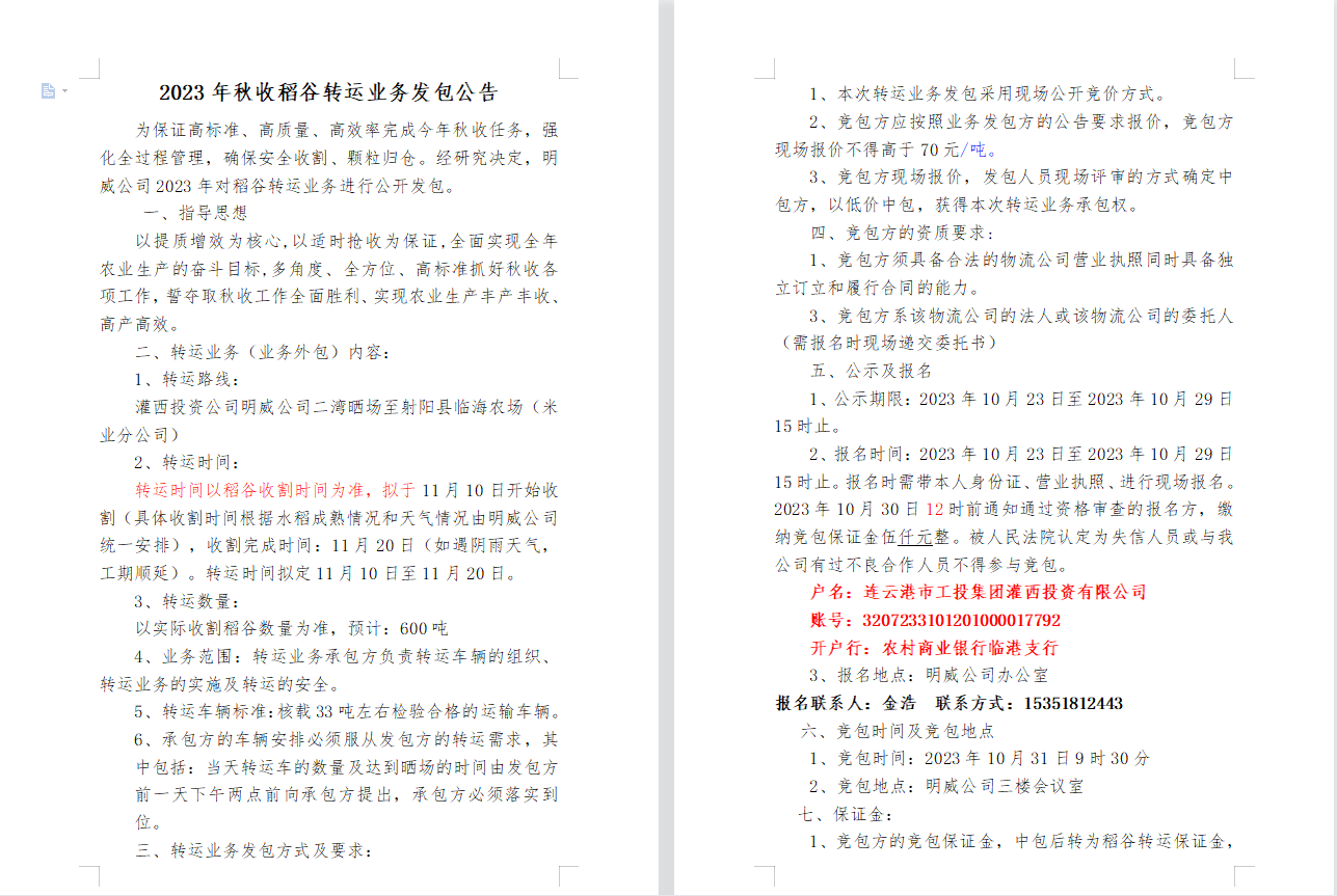 2023年秋收稻谷轉運業務發包公告