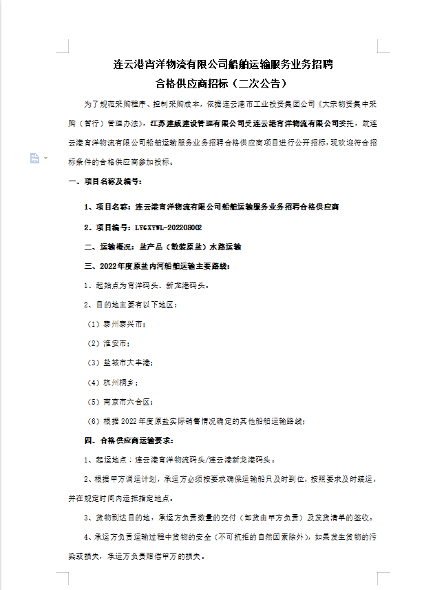 連云港宵洋物流有限公司船舶運輸服務業務招聘合格供應商招標(二次公告)