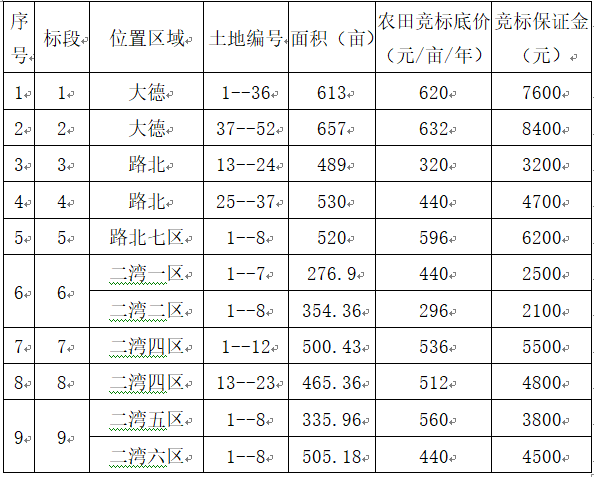 一、競標農田標段、位置、面積、競標底價、競標保證金: