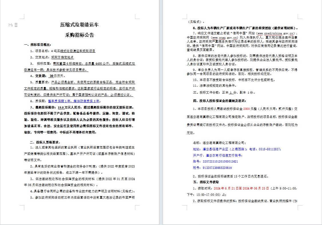 壓縮式垃圾清運(yùn)車(chē)采購(gòu)招標(biāo)公告