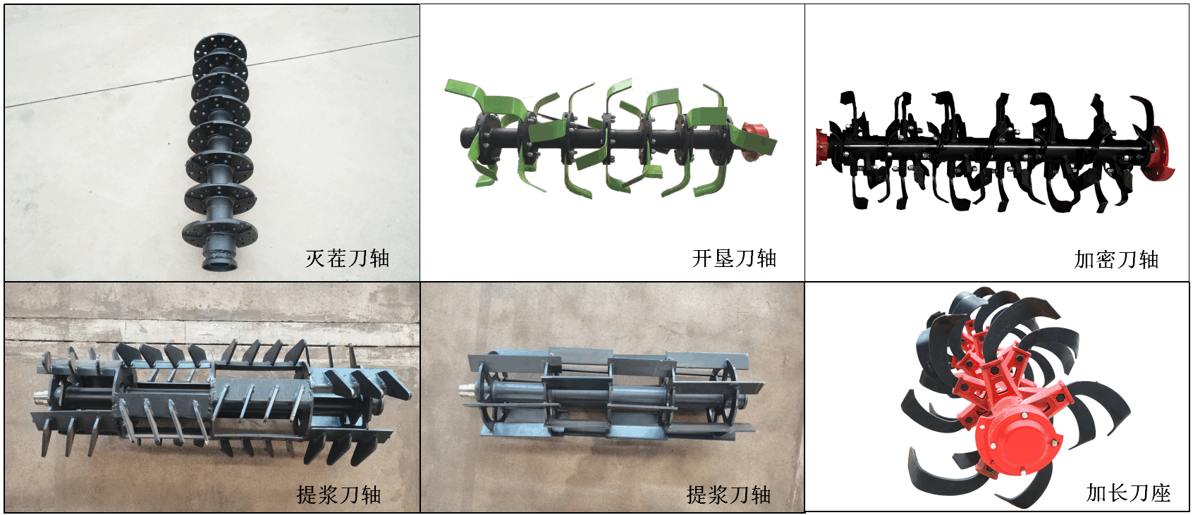可根據水旱田及農藝需要配制:滅茬刀軸、開墾刀軸、加密刀軸、提漿刀軸、加長刀座