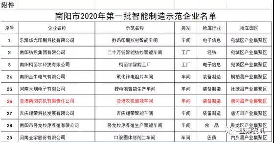 南陽市2020年第一批智能制造示范企業名單公布, 亞澳農機入選