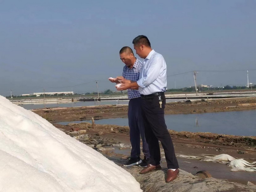 第一片180公畝的曬鹽池已經收鹽完畢,工人師傅們嫻熟有序用塑布對鹽廩進行覆蓋,預防雨水造成鹽斤淌化。