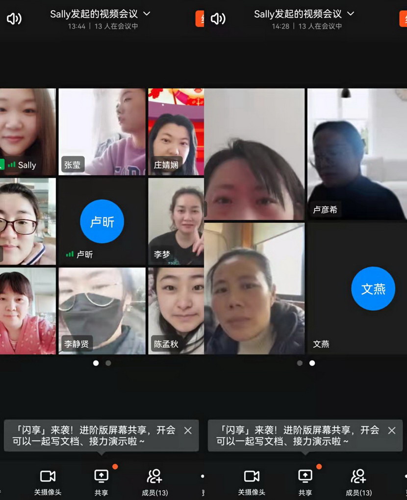 線上貢獻(xiàn)篇。“縱然居家隔離,一樣不防礙我們做貢獻(xiàn),我們線上服務(wù)已經(jīng)開啟”三八節(jié)這一天,在社區(qū)忙碌一天的公司女工委副主任宋文靜又特意安排了“三八”節(jié)線上活動(dòng)。這一天活動(dòng)精彩紛呈:首先是視頻連線,通過廣大女工并向她們家人傳達(dá)市委市政府以及集團(tuán)黨委、投資公司黨委關(guān)于疫情防控文件精神。其次共同學(xué)習(xí)全國“兩會”會議精神。第三,開展公司“三新”解放思想大討論線上論壇,圍繞疫情防控、生產(chǎn)經(jīng)營,尤其是企業(yè)轉(zhuǎn)型發(fā)展出謀劃策。最后還來了點(diǎn)小游戲-成語“飛花令”,給嚴(yán)肅的疫情防控增添了一息歡樂的氛圍。